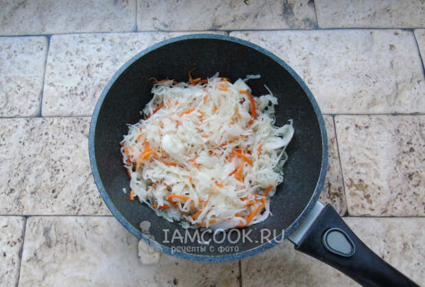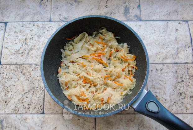 Квашеную капусту отожмите от рассола и добавьте к луку в сковороду.