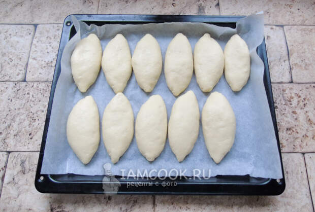 Выложите пирожки швом вниз на противень с пекарской бумагой