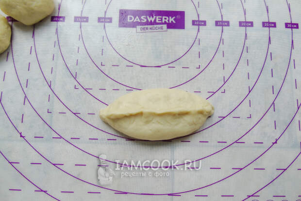 Каждый шарик раскатайте в лепешку, на середину которой выложите начинку.