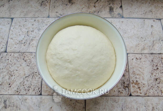 Накройте миску с тестом пищевой пленкой и поставьте в теплое место. Через 50-60 минут тесто подойдет и значительно увеличится в объеме.