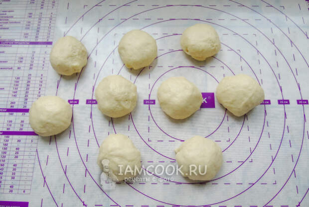 Подошедшее тесто достаньте из миски и обомните. Разделите на шарики.