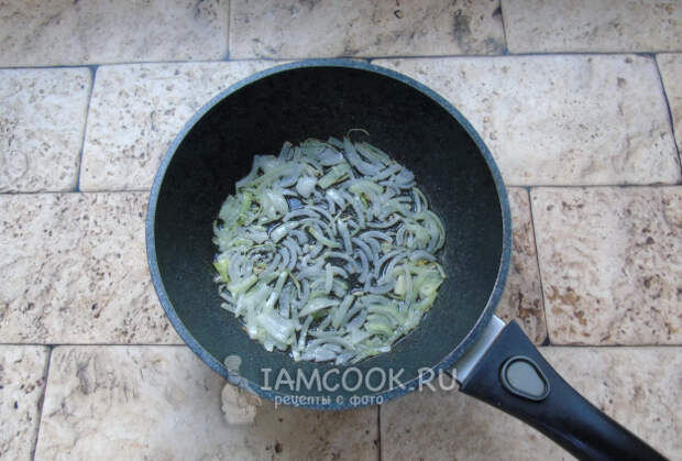 Пока тесто подходит, займитесь начинкой для пирожков. Репчатый лук очистите, помойте и нарежьте. Выложите в сковороду с растительным маслом.