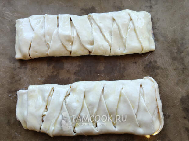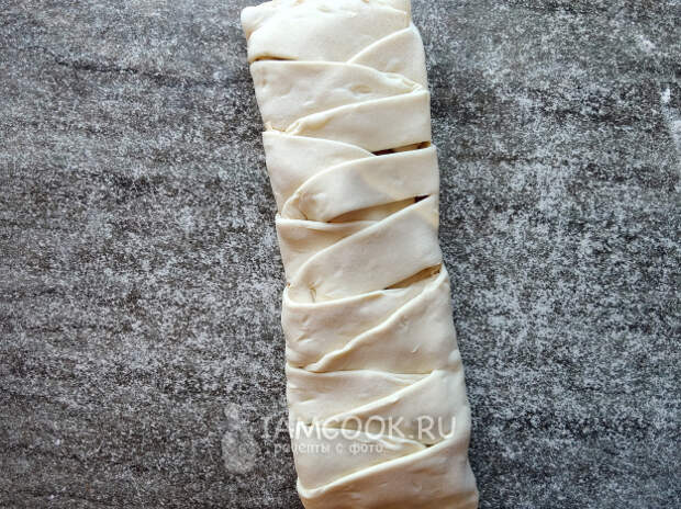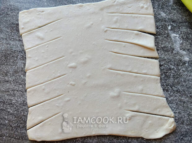 Тесто раскатать. Сделать по краям разрезы полосками. Можно и не нарезать, мне так показалось интереснее.