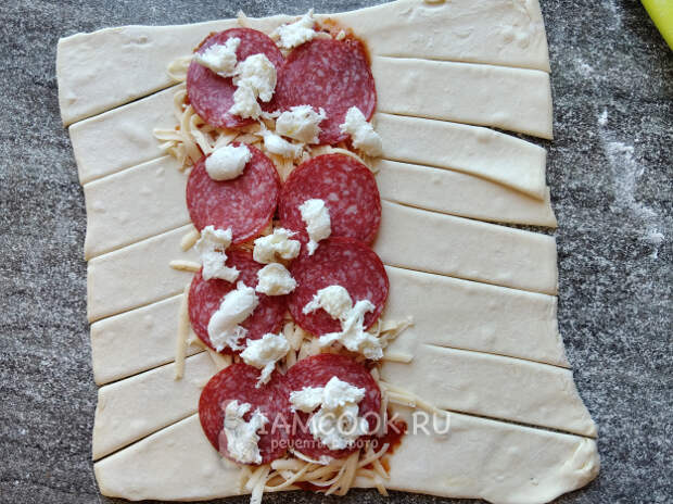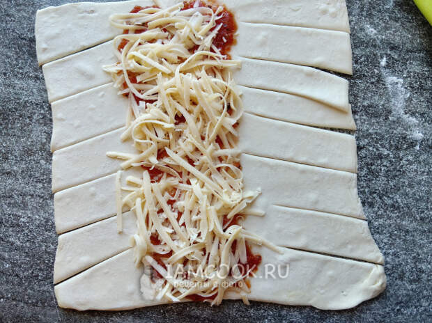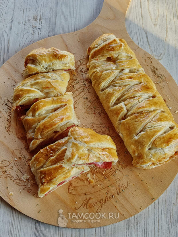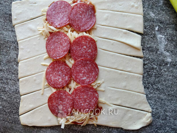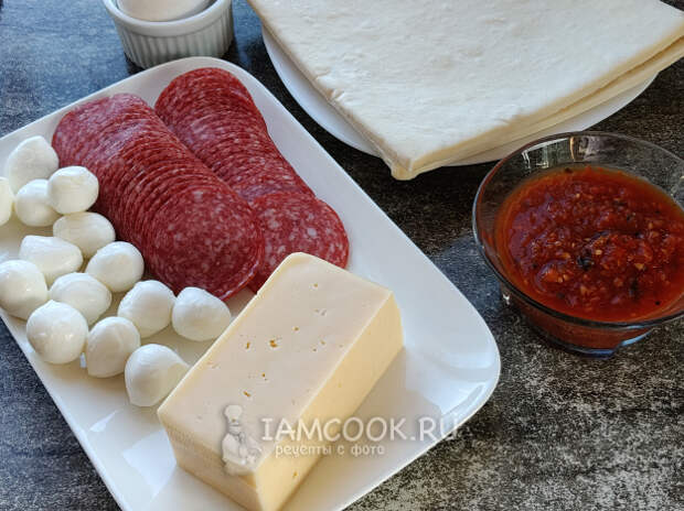 Пиццу-рулет из слоеного теста в духовке готовить будем из таких ингредиентов.