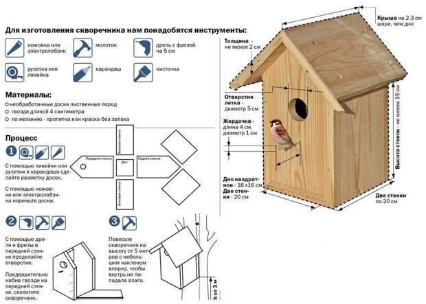 Что представляет собой жилье для птиц? Это, по сути, замена привычного им для гнездовья дупла – достаточно большая полость, ограниченная со всех сторон прочными стенками и крышей. Отверстие-леток, через которое «жильцы» проникают внутрь, должно быть немного больше размера самой птицы. Но поскольку не все крылатые могут слета попасть в такое отверстие, на передней стенке скворечника обычно делают посадочную жердочку или выступ.
