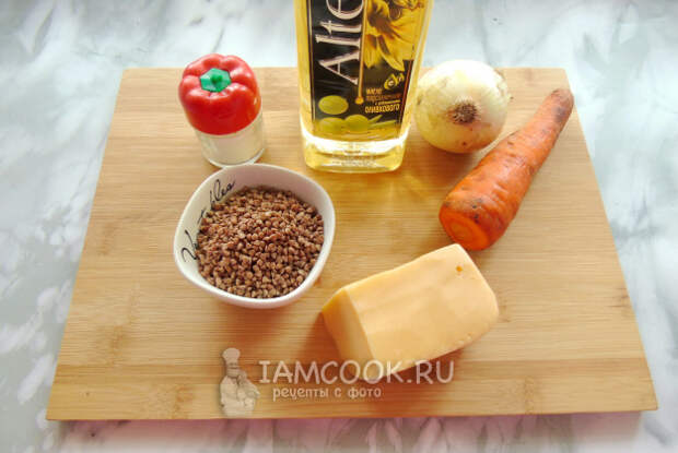 Соберите ингредиенты для приготовления гречки с сыром.
