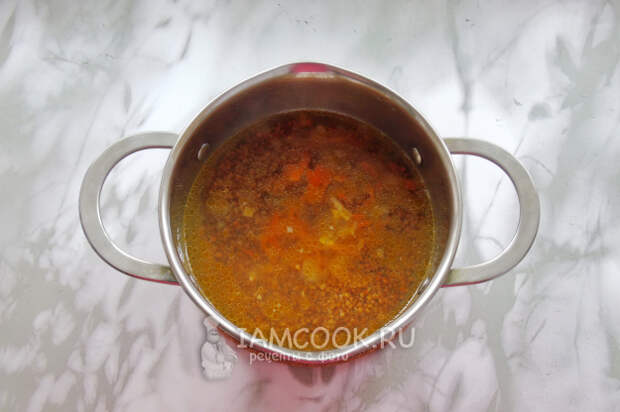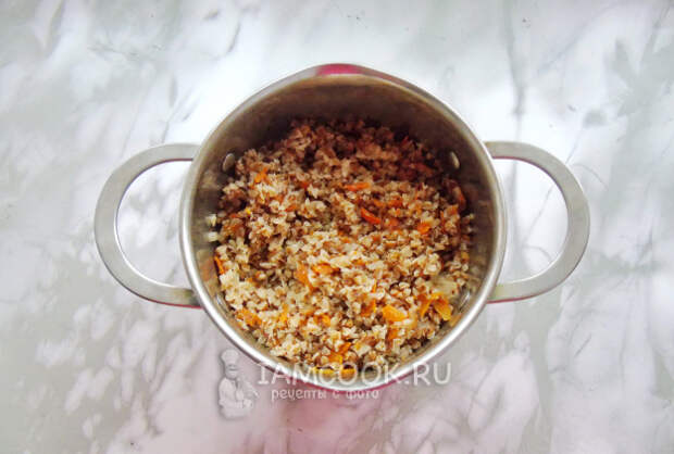 Гречневую крупу промойте в проточной воде. Добавьте в кастрюлю с овощами. Залейте водой и посолите.