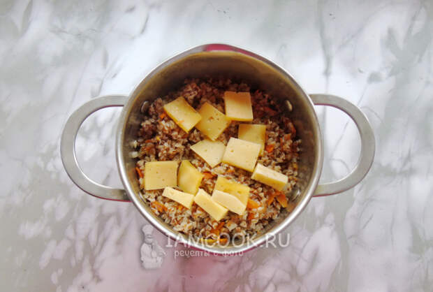 Затем добавьте нарезанный полутвердый сыр. Можно взять твердый, который хорошо плавится. Перемешайте сыр с гречкой до полного растворения. При необходимости прогрейте на слабом огне около минуты.