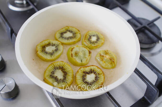 Как только сахар растает, выложите киви. Убавьте огонь и жарьте киви с одной стороны примерно 4-5 минут.