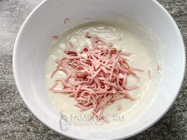 Натереть в тесто колбасу.