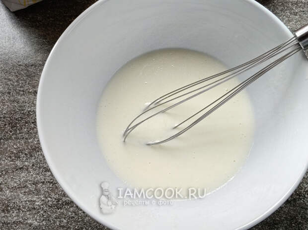 Добавить часть муки и соду, размешать, чтобы не было комочков.