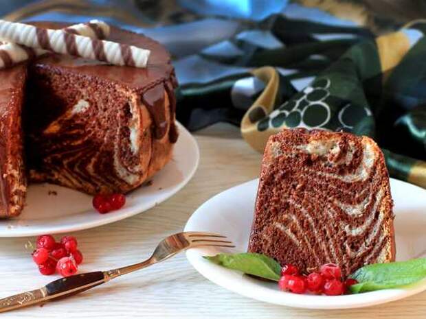Готовый бисквит "Зебра" остудить и украсить по своему выбору. Я просто смазала поверхность растопленным черным шоколадом, добавив в него чайную ложку растительного масла.