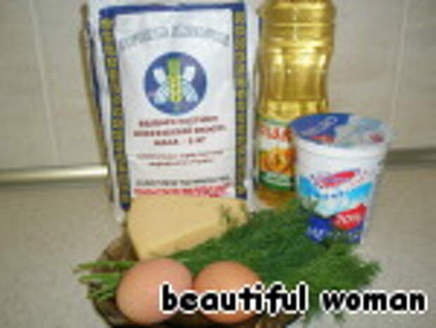 Выкладываем все продукты сразу: натертый сыр, два яйца, сметану, нашинкованую зелень укропа и две столовые ложки с большой горкой муки.