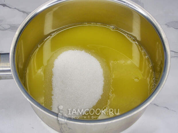 Сначала сварим сироп для пропитки пирога. Из апельсина и половинки лимона выжимаем сок, смешиваем его с водой, добавляем сахар и перемешиваем.