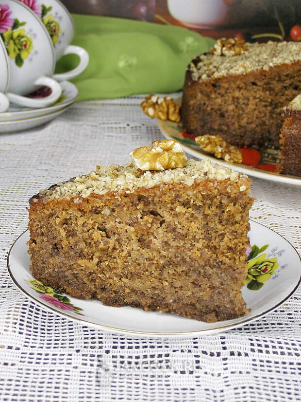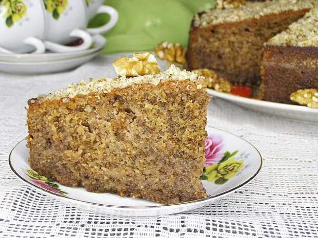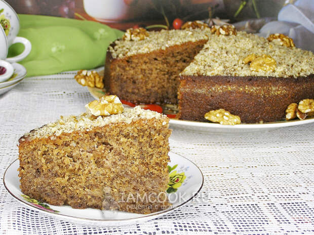 Достаём пирог из формы, сверху смазываем оставшимся сиропом и украшаем измельчёнными или целыми грецкими орехами.