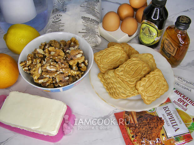 Подготовим по списку продукты для приготовления греческого десертного пирога Каридопита. Вместо печенья можно использовать панировочные сухари. Сливочное масло и яйца желательно заранее достать из холодильника, чтобы они согрелись до комнатной температуры.