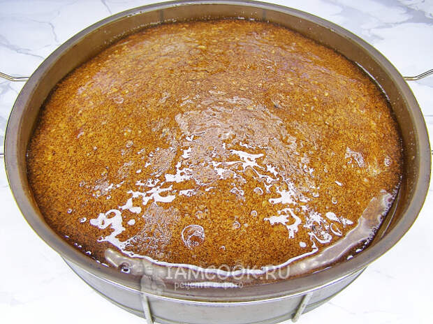 Готовый пирог заливаем остывшим процеженным сиропом и оставляем пропитываться минимум на 2 часа, но можно оставить на ночь или даже на сутки. Пару ложек сиропа отложим для украшения пирога.