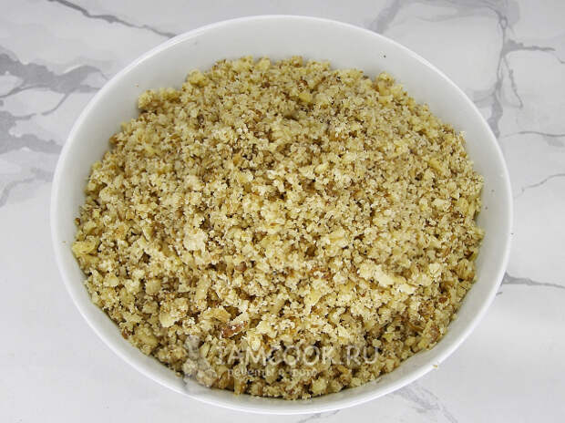 Печенье тоже измельчаем, но в отличие от орехов, печенье лучше измельчить до крошки.