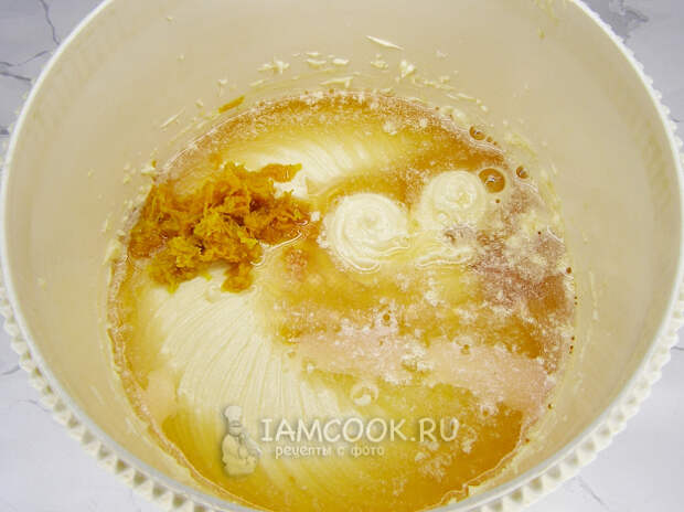 С апельсина и половины лимона счищаем цедру мелкой тёркой, добавляем её в смесь и вливаем 75 мл коньяка. Всё хорошо перемешиваем миксером до однородного состояния.
