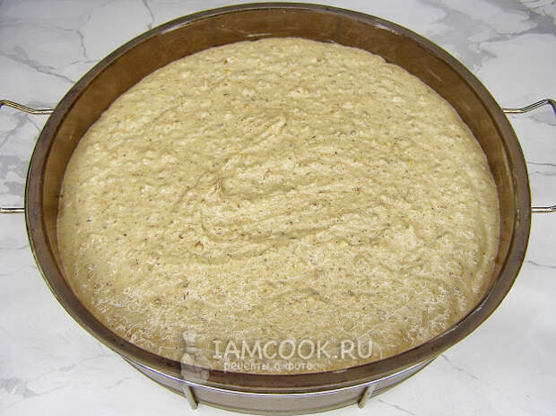 Форму для выпечки смазываем маслом или маргарином и переливаем в неё тесто.