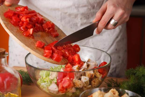 Добавить в миску нарезанные помидоры.