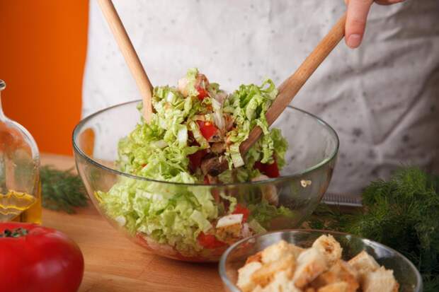 Выложить салат на листья пекинской капусты, посыпать сухариками и рубленой зеленью.
