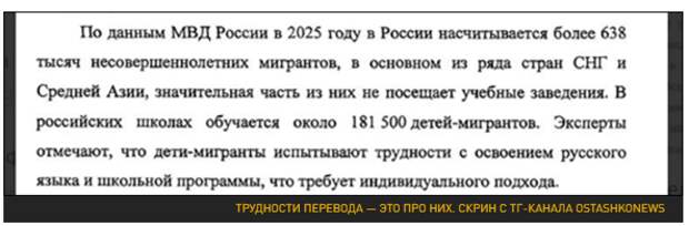 Цифры, приведённые депутатом Матвеевым, хуже. На июньском заседании Думы он указал, что в МВД путаются в цифрах. В февральском ответе на депутатский запрос было сказано: в России находятся 783 тыс. несовершеннолетних иностранных граждан. Из них учатся всего 192 тыс. Чем заняты остальные?