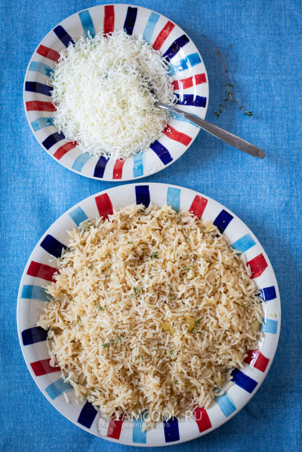 Каждая порция риса с луком посыпается сыром и несколькими листиками тимьяна. Люди, тимьян НУЖЕН, без тимьяна - НЕ ТО!!! Нету без тимьяна настоящего гурманского кайфа, чтобы каждая вкусовая нотка звучала безукоризненно.