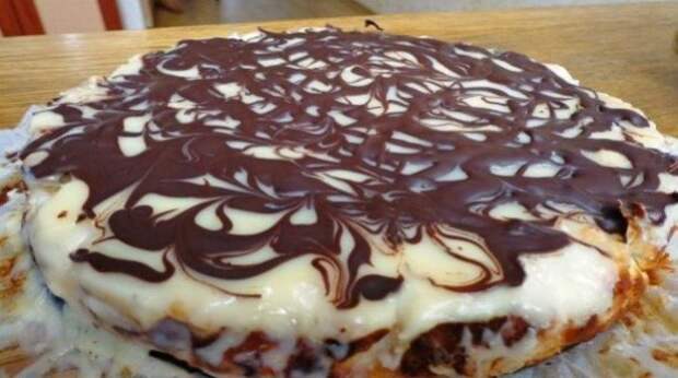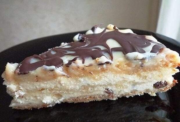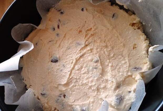 2. Составляющие смеси 2 (яйца, творог, сахар 105 г, ванильный сахар) соединить и взбить до однородности. 3. Форму диаметром примерно 25 см выстелить пергаментной бумагой, смесь 1 разделить на 3 части, смесь 2 на две части. Выкладывать по очереди, начинаем с первой смеси и ею же заканчиваем. 4. В творожную смесь еще и изюм добавила 5. Ставим форму в разогретую до 180 градусов духовку и выпекаем примерно 50-60 минут. 6. Соединить вместе сметану и сгущенку. Отдельно растопить на паровой бане или в микроволновке шоколад (при мощности 600 мощности топить 2 минуты). 7. Готовую ватрушку вынуть из духовки, сразу же залить заливкой и сверху ложкой покапать шоколадом, затем зубочисткой или спичкой можно порисовать узорчики. 8. Затем ватрушке дать остыть при комнатной температуре и отправить до полного застывания в холодильник. Только потом уже вынимать ее с формы.