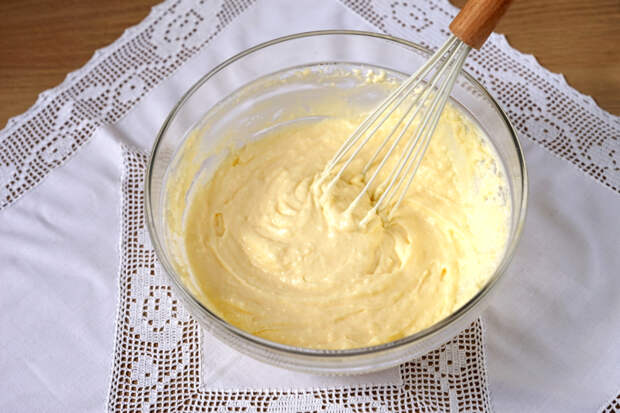 Как только масса станет однородной, влить еще одну часть яиц и снова перемешать. Так же поступить с последней частью яиц.