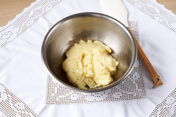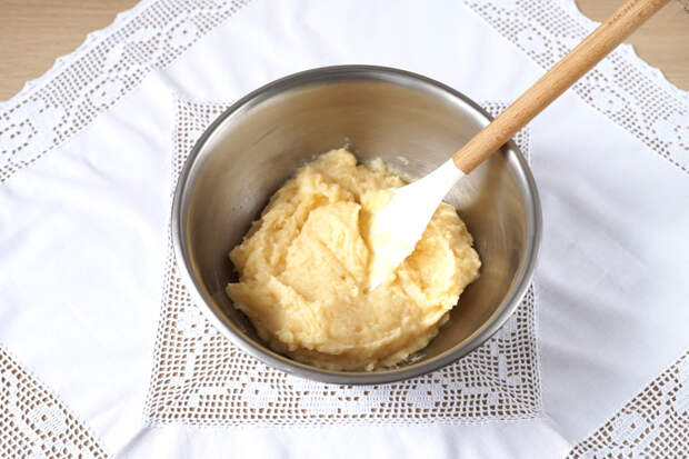 В стакан вбить 3 яйца и перемешать вилочкой. Когда тесто немного остынет, влить 1/3 часть яиц в него и тщательно размещать с помощью деревянной или силиконовой лопатки.