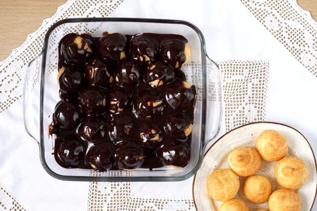 Часть профитролей убрать в сторону, а вторую часть выложить в глубокое блюдо или форму. Залить профитроли тёплой шоколадной глазурью.