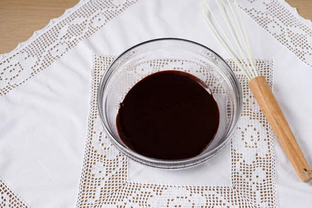 Сахар должен полностью раствориться. Снять шоколадную глазурь с плиты, перелить в миску и убрать в сторону.