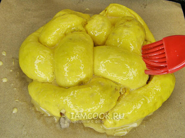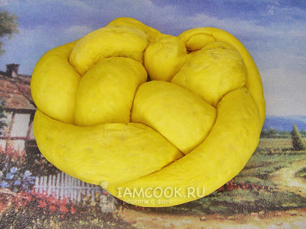 Перекладываем плетёнку на противень, застеленный пергаментной бумагой, и оставляем минут на 20 для расстойки, прикрыв полотенцем. По желанию перед выпечкой можно смазать верх и бока взбитым яйцом.