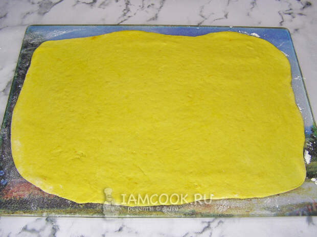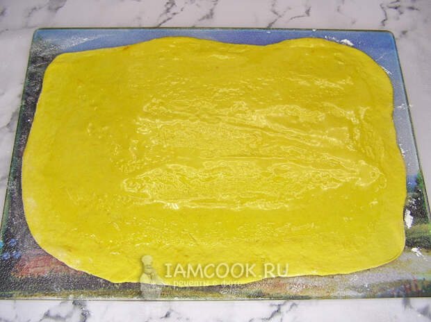 Тесто делим на три равные части и каждую часть тонко раскатываем прямоугольником размером примерно 25 на 35 сантиметров.