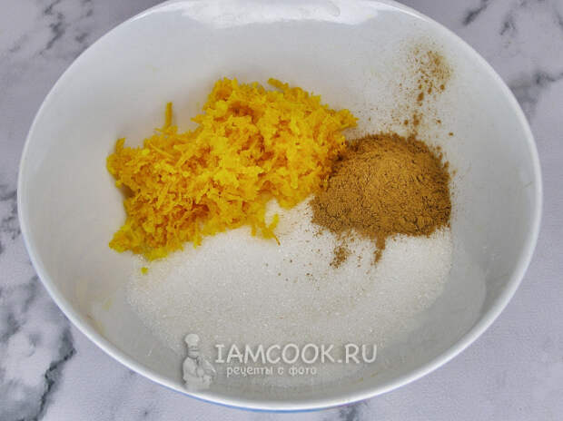 Для приготовления начинки смешиваем сахар, корицу и натёртую на мелкой тёрке цедру апельсина. При натирании цедры старайтесь не задевать белую часть, так как она будет горчить.