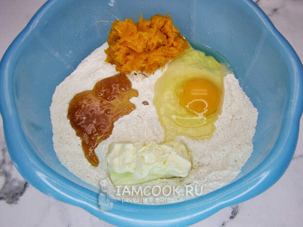 Добавляем в муку яйцо, мёд, сливочное масло и тыквенное пюре.