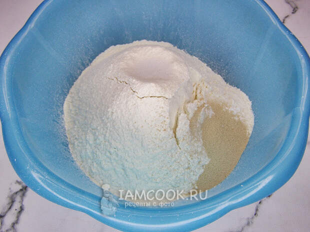 Для приготовления теста в миску просеиваем муку, добавляем в неё сухие дрожжи, соль, сахар, ванилин и перемешиваем.
