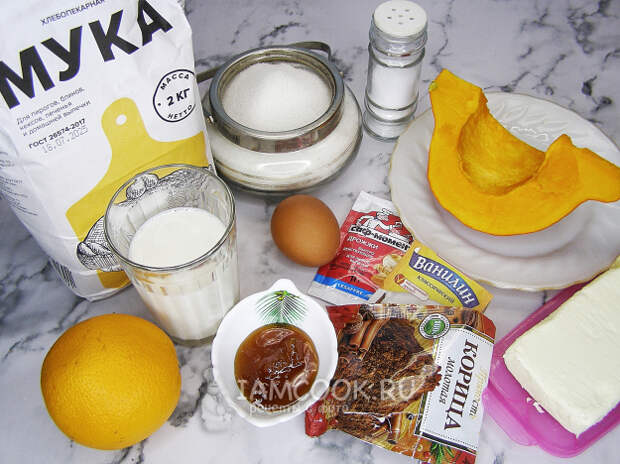 Соберем продукты для приготовления тыквенной плетёнки. Яйцо и сливочное масло нужно заранее достать из холодильника, чтобы они прогрелись до комнатной температуры, а молоко подогреть на плите примерно до 36-40 градусов.