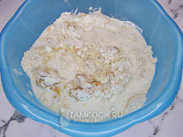 Вливаем в тесто тёплое молоко и замешиваем тесто.