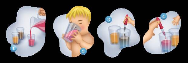 3) Выдайте детям пипетки и стаканы с небольшим количеством чистой воды. Попросите по капельке добавлять в свою воду другие напитки, при этом делайте акцент на том, как меняется окрас воды и ее вкус.